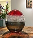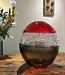 Im unteren Teil der Kristallkugel bildet eine transparente, graue Schicht das ruhige Fundament wie eine stille Erde unter einem feurigen Himmel aus. Zwischen der roten und grauen Schicht schwebt eine transparente Kristallschicht, in der Luftblasen wie eingefrorene Gedanken oder Momente der Stille gefangen zu sein scheinen. Die gewölbte Form, das Spiel des Lichts im Glas und die Symbolik des Horizonts machen dieses Objekt zu einem einzigartigen Blickfang, der immer wieder fasziniert.