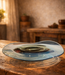 Die Schale zeichnet sich durch ihre organische, fließende Form und den dezent gewellten Rand aus, wodurch das Objekt aus jedem Blickwinkel eine andere Ausstrahlung erhält. In der Mitte befindet sich ein vertieftes, rundes Element, das für optische Tiefe sowie ein faszinierendes Spiel von Licht und Reflexionen sorgt. Der sanfte Übergang vom dunkleren Kern zum klaren Blau verstärkt die räumliche Wirkung und verleiht der Schale eine ruhige, beinahe wasserartige Anmutung.