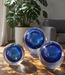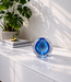 Diese „Kristallkugel“ hat eine tiefblaue Farbe. Die feine Luftblasen in der Kugel verleihen dem Objekt Lebendigkeit und machen jedes Stück einzigartig. Durch die runde Form wirkt das Objekt zugleich ruhig und kraftvoll.