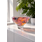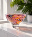 Im klaren Glas entfaltet sich ein lebendiges Farbspiel aus warmen Tönen wie Rot, Orange und Rosa, ergänzt durch subtile Akzente weiterer Farben. Diese wirken wie frei im Glas schwebende, abstrakte Pinselstriche.