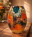 Handgefertigte Glaskunstvase mit warmen Orange- und Goldtönen, kombiniert mit Blau- und Grüntönen..