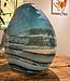 Elke vaas is uniek, zorgvuldig vervaardigd door ambachtslieden die hun vakkennis gebruiken om een harmonie van kleuren en texturen te creëren. Het grijze spikkelpad en de witte banen spreken van een stille beweging, alsof ze door de lucht of door de tijd zelf zijn gevormd. Het blauwe bovenste gedeelte lijkt de lucht te vangen, terwijl de onderkant de rustige aardse stilte weerspiegelt.