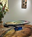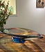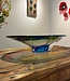 Deze handgeblazen schaal is een waar kunstwerk: de vloeiende, organische vorm en het prachtige kleurenpalet maken elk exemplaar uniek. Warme tinten zoals diepblauw, smaraggroen, zonnig geel, oranje en zachtroze vloeien subtiel in elkaar over. Wanneer het licht de schaal raakt, ontstaat er een fascinerend spel van reflecties en kleuren – een levendig kunstobject dat constant in beweging lijkt.